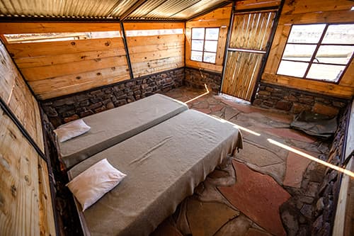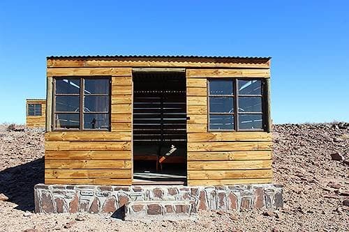 Each camp has cabins with beds and mattresses as well as communal bathrooms. A central cabin serves as a dining area and kitchen, while a fire pit or braai-place outdoors is provided for braais/barbeques. Each camp has its own cutlery and crockery, including a kettle, braai grids and a gas stove. Firewood is available. For detailed information on each camp please download the info pack on the right.