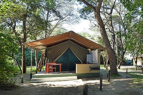 The camp features eight self-catering safari tents, each designed to accommodate up to four guests. These tents boast en-suite bathrooms, fully equipped kitchens, private verandas, fridges, mosquito nets, and water coolers. Whether you prefer preparing your meals or indulging in delicious offerings from the on-site à la carte restaurant, the choice is yours. For an authentic African experience, grab a braai pack and enjoy a barbecue under the stars.